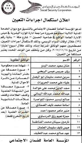 طالبت المؤسسة العامة للضمان الاجتماعي وبالتنسيق مع ديوان الخدمة المدنية التالية أسماؤهم مراجعة إدارة الموارد البشرية في مبنى الإدارة العامة في ضاحية الياسمين – شارع مكة بناية رقم 29 ، وذلك لاستكمال إجراءات التعيين في المؤسسة، في موعد أقصاه 21/11/2017، وتالياً الأسماء: