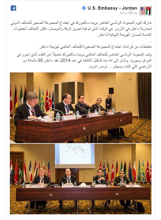 وبينت ان المبعوث الرئاسي الخاص للتحالف الدولي بريت ماكغورك قدم ، تحديثا عن التقدم الذي أحرز في العراق وسوريا، مشيرا إلى أنه "منذ تشكيل التحالف في عام 2014، خسر داعش 95 % من الأراضي التي كانت يسيطر عليها في العراق وسوريا".