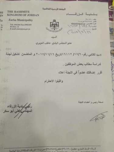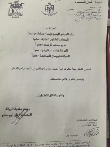 لانه محامي و مهندس نقابي ونائب للشعب قبل ان يكون رئيسا لبلدية الزرقاء وفي اجراء يعتبر الاول على مستوى بلديات المملكه اقدم المهندس علي ابو السكر على تشكيل لجنه من جسم ورحم البلديه لدراسة اوضاع وطلبات الموظفين الذين اجتمع مع عدد منهم