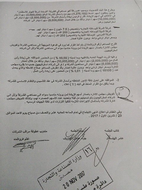 قرار الزيادة جاء في توقيت حرج وصعب خصوصا بعد أن نجحت الشركة في كسب عدة قضايا على وزارات حكومية كانت قد عطلت قضايا لها علاقة بزيادة رأس المال والرسوم المترتبة عليها وعندما جاء المساهمين ليفرحوا بهذا النصر والمكسب الذي طال انتظارهم كثيرا ليتبدد مع دعوة مجلس الإدارة إلى اجتماع غير عادي عقد بتاريخ 29/10/2017 في فندق الدانا بلازا برئاسة رئيس مجلس الإدارة جواد عدنان الخروف وبحضور مندوب عطوفة مراقب عام الشركات أكثم الرواشدة وبحضور مساهمين يملكون ما نسبته 80% من رأس مال الشركة، حيث خصص جدول الأعمال إلى زيادة رأس المال من خلال إصدار 8 مليون سهم – دينار إلى مساهمي الشركة و/أو شريك استراتيجي بسعر دينار واحد للسهم ودون علاوة إصدار، مما دفع بعض المساهمين إلى طرح استفسارات وملاحظات حول القرار والغاية منه ومبرراته وأسبابه وتوقيته إلا أن الخروف رد على كل هذه الملاحظات مؤكداً بأن زيادة رأس المال سوف تكون مفيدة للشركة أكثر من قيمة الأرباح المتحققة من القضية معتبراً أن صافي المبلغ المتوقع تحصيله للشركة من القضية لن يتجاوز 900 ألف دينار بعد خصم أتعاب المحاماة والمصاريف الأخرى، مؤكداً مرة أخرى بأن الشركة لها مصلحة في زيادة رأس مال الشركة لتعظيم إيراداتها التشغيلية.