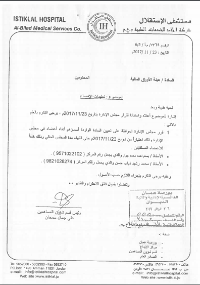 قرر مجلس إدارة مستشفى الاستقلال "شركة البلاد للخدمات الطبية" تعيين بسام أحمد جرار ومحمد رشيد ذياب حسن عضوين في مجلس إدارة الشركة خلفاً لعضوين مستقيلين.