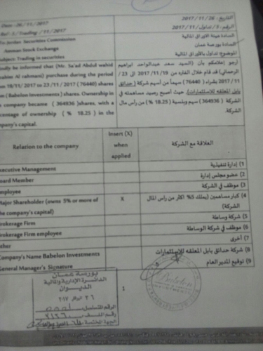 أخبار البلد - قدمت شركة حدائق بابل المعلقة للاستثمارات إفصاحا إلى هيئة الأوراق المالية ،بشأن قيام سعد عبد الواحد إبراهيم الرحماني بشراء (76440) سهما من أسهم الشركة .
