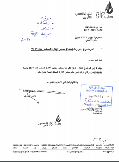 قامت شركة الشرق العربي للتأمين بتعيين توفيق مكحل عضواً مستقلاً في مجلس إدارة الشركة لإستكمال نصاب المجلس وذلك بعد تسمية مجموعة الخليج للتأمين 4 أعضاء فقط في مجلس الإدارة بدلاً من 5 أعضاء.