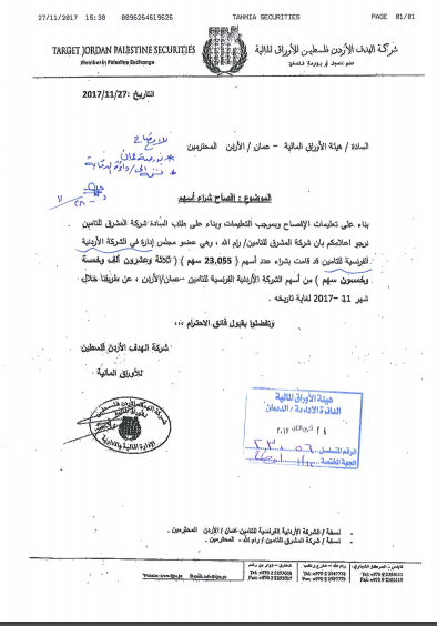قامت شركة المشرق للتأمين / رام الله عضو مجلس إدارة الشركة الأردنية الفرنسية للتأمين بشراء 23055 سهم من أسهم الشركة بواسطة شركة الهدف الأردن فلسطين.