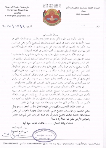 أخبار البلد - متابعة جلنار الراميني - دعت النقابة العامة للعاملين للكهرباء ممثلي