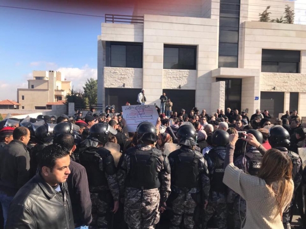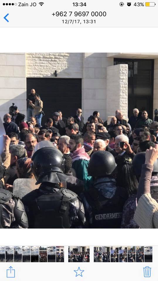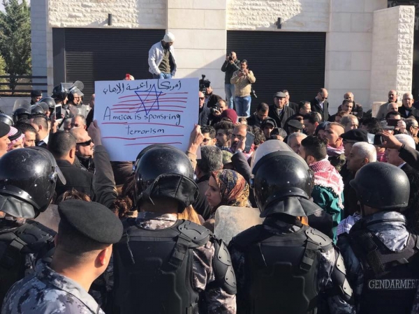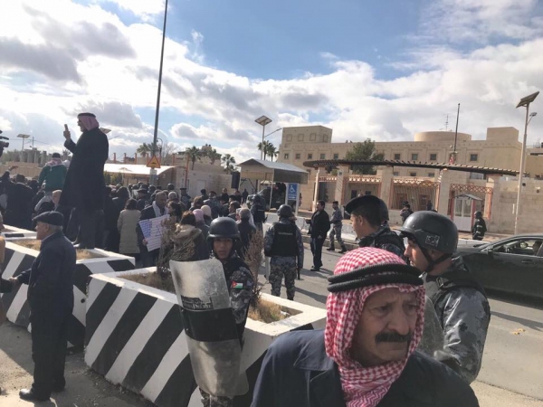 أخبار البلد - جلنار الراميني - تعتصم حاليا أمام السفارة الأمريكية النقابات المهنية وعدد من الاحزاب السياسية ،تنديدا بقرار الرئيس الأمريكي دونالد ترامب القاضي بنقل السفارة الأمريكية إلى القدس.