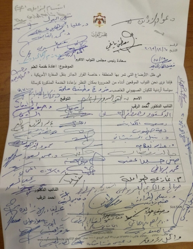 وبين الرقب في مذكرته أن إعادة العمل في خدمة العلم ضرورة وطنية ملحة، خصوصاً في هذا الوقت في ظل القرار الأمريكي الجائر بنقل السفارة، على حد تعبيره.