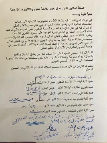 وزاد البيان، بأنه في الوقت الذي تقدمت فيه جامعة العلوم والتكنولوجيا إلى مصاف الجامعات العالمية المرموقة، وحققت الحلم الأردني الذي سعى التعليم العالي الوصول إليه في الفترة الزمنية القصيرة لرئاسة الدكتور عمر الجراح والتي تم فيها انشاء العديد من المشاريع الاستراتيجية النوعية على مستوى الشرق الأوسط، وضبط النفقات، يصدر مجلس التعليم العالي قراره بإعفاء مهندس هذه الإنجازات من منصبه في سابقة غريبة، وبطريقة يندى لها الجبين، لم يشهدها تاريخ التعليم العالي الأردني الأمر الذي لن يحسب إلا إعاقة لعجلة الابداع وانتقاصا لحجم الانجاز في جامعة العلوم والتكنولوجيا والتعليم العالي.