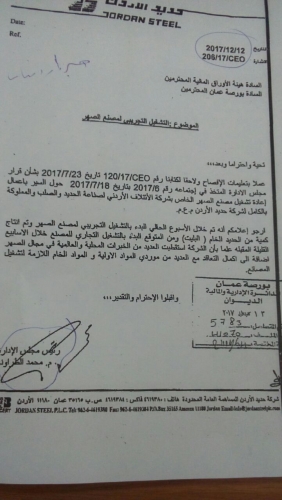 18/7/2017،حول السير بأعمال إعادة تشغيل مصنع الصهر الخاص بشركة الائتلاف الأردني