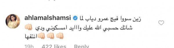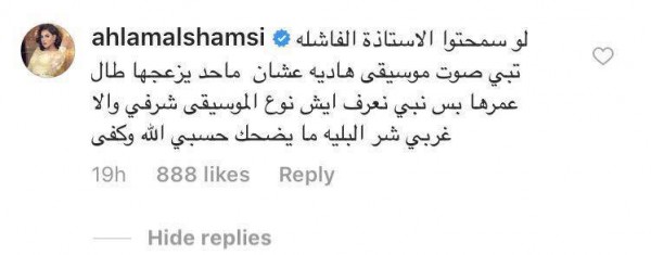 ولم تكتفِ احلام بذلك بل دخلت في الأمور الشخصية وتطرقت لطلاق رضا من عمرو دياب حيث كتبت في تعليق آخر : "زين سوا فيك عمرو دياب شاتك"، واضافت انها تريد ان "تنتفها"، ووصفت في تعليق آخر شيرين بـ"الفاشلة"، وهي تريد موسيقى هادئة حتى لا تنزعج، وختمت: "شر البلية ما يضحك".