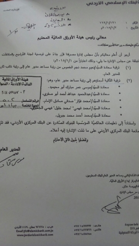 جاء ذلك خلال إفصاح وصل "أخبار البلد" نسخة منه، لهيئة الأوراق المالية حمل توقيع المدير العام موسى شحادة ،حيث تم ترقية نعيم محمد نجم الخموس من رتبة مساعد مدير عام إلى رتبة نائب ثان للمدير العام.
