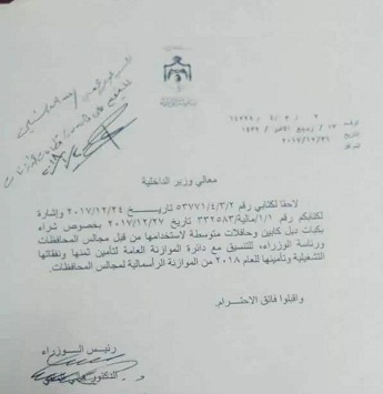 ويبين الكتاب أن الملقي يوعز بتأمين ثمنها ونفقاتها التشغيلية وتأمينها للعام 2018 من الموازنة الرأسمالية لمجالس المحافظات.