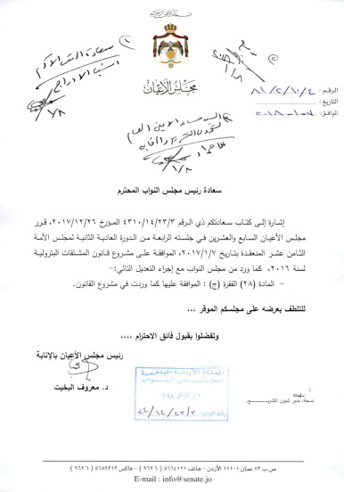 وكان مجلس الأعيان وافق على القانون كما ورد من مجلس النواب، مع تعديل المادة 28 الفقرة ج، حيث وافق عليها كما وردت بالقانون قبل تعديل النواب.