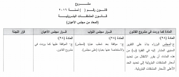 وكان مجلس النواب قد عدل المادة 28 الفقرة ج من: لمجلس الوزراء بناء على التقرير السنوي(....) الانتقال من تحديد أسعار المشتقات النفطية إلى تحديد الحد الأعلى لأسعار المشتقات النفطية، إلى : على مجلس الوزراء بناء على التقرير السنوي(....) الانتقال من تحديد أسعار المشتقات النفطية إلى تحديد الحد الأعلى لأسعار المشتقات النفطية.