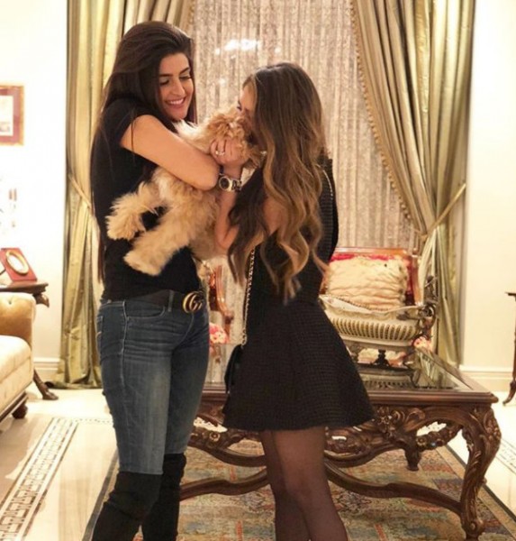 وأطلّت الفارس الى جانب إحدى صديقاتها أو قريباتها، وهي تلاعب كلباً تحمله بين يديها.