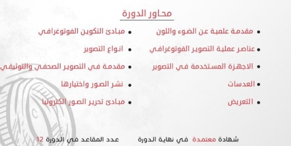 ويتوقع من المتدرب بعدالمحاضرات النظرية والتدريب العملي أن يستطيع التعامل بحرفية وسهولة مع معدات التصوير المختلفة، والإحاطة بمبادئ التصوير ومهاراته، يحصل المتدرب بعد الدورة على شهادة معتمدة .
