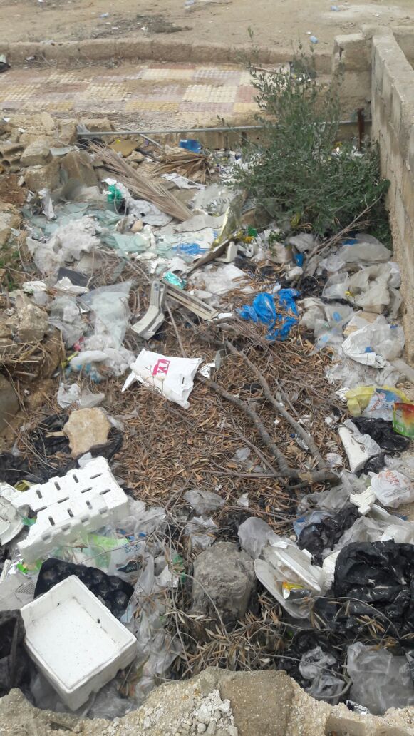 امام هذه البنايه وبداخلها الاطنان من النفايات وتعد من اكبر المكاره الصحيه وتشكل خطوره صحيه على اهالي المنطقه