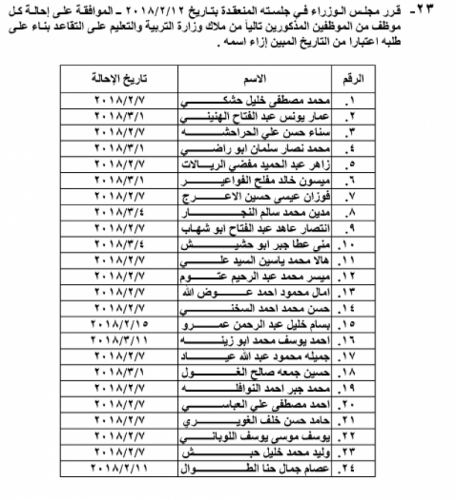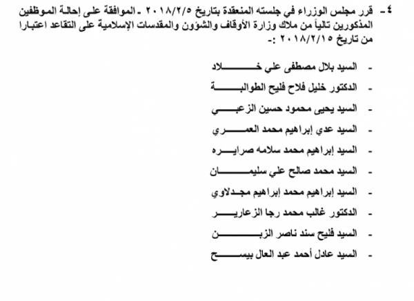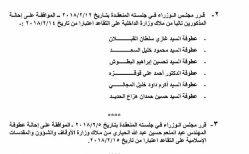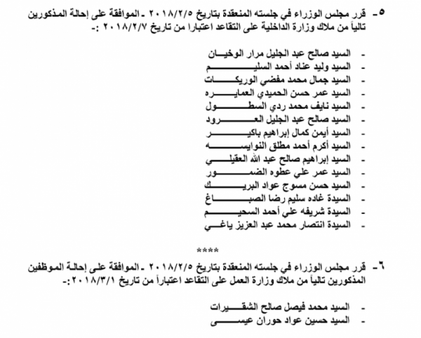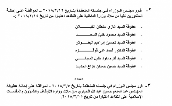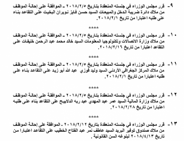 صدر في عدد الجريدة الرسمية اليوم الخميس قرارات مجلس الوزراء بإحالة عدد من الموظفين في عدة وزارات ودوائر رسمية الى التقاعد، والتي جاءت على النحو التالي: