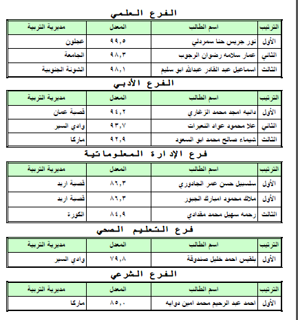 عمار الرجوب 98,3 - لواء الجامعة اسماعيل عبد القادر 98,1 - الشونة الجنوبية الادبي : دانية امجد الزغاري 94,2 - عمان علا نعيرت 93,7 - وادي السير شيماء ابو السعود 92,9 - ماركا الادارة : سلسبيل الجالودي 86,3 - اربد ملاك محمود الجبور 86،3 - اربد رحمة سهيل مقدادي 84,9 - الكورة التعليم ا لصحي : بلقيس صندوقة : 79,8 الشرعي : احمد دوايه : 85 - ماركا الصناعي : محمد الزعاترة : 91 - مادبا الزراعي : نديم سعيد : 91,9 المنزلي : احلام علي قاسم 96,1