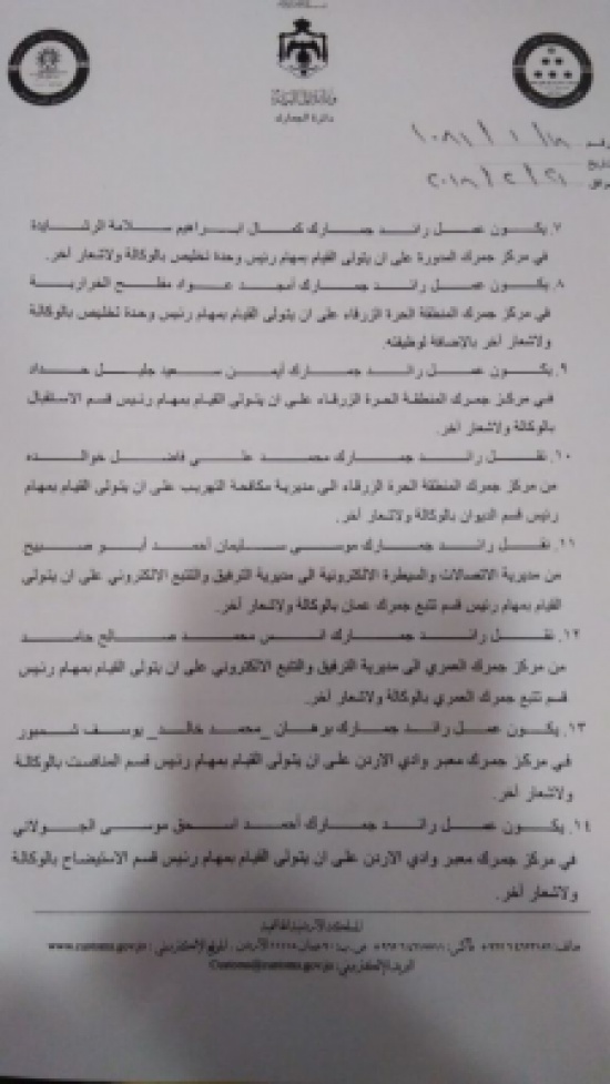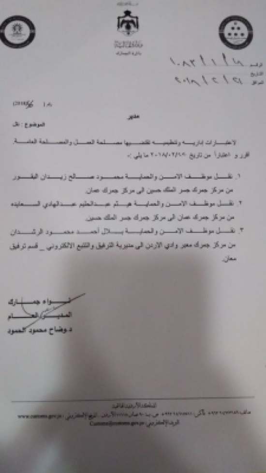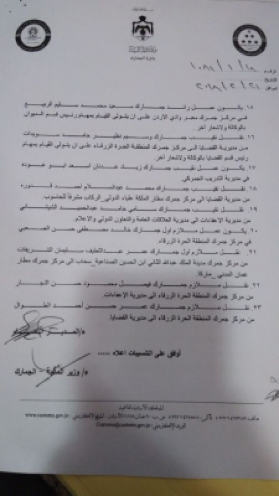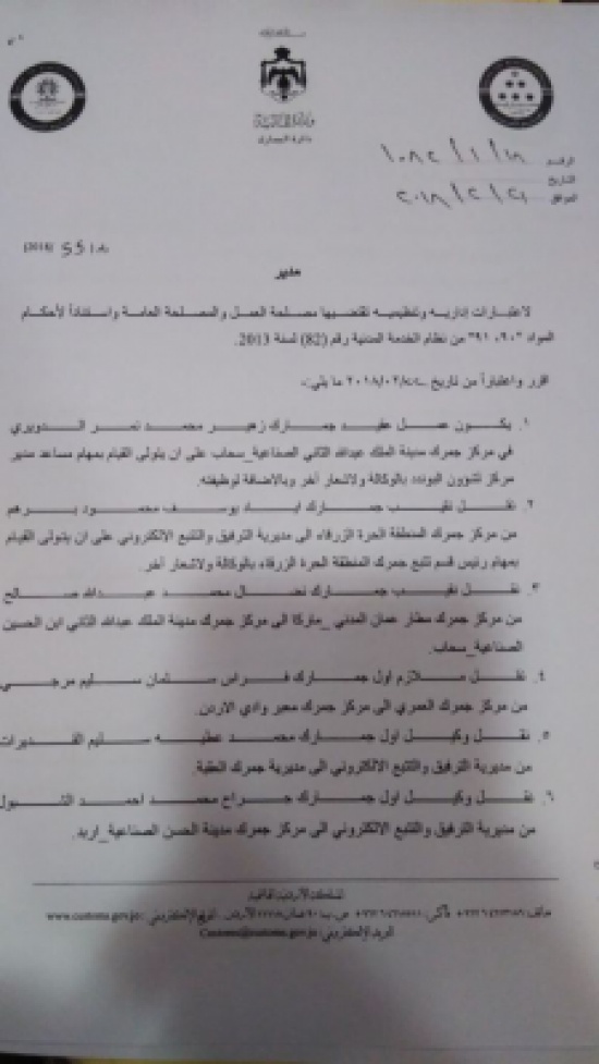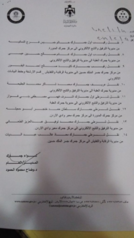 قرر مدير الجمارك اللواء وضاح الحمود ، الاربعاء اجراء تنقلات في الدائرة شملت العديد من الموظفين بمختلف الرتب.