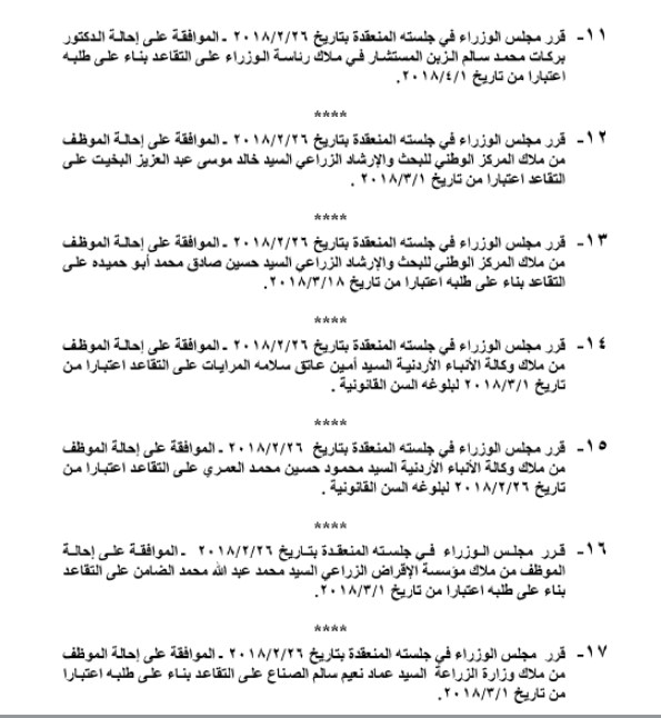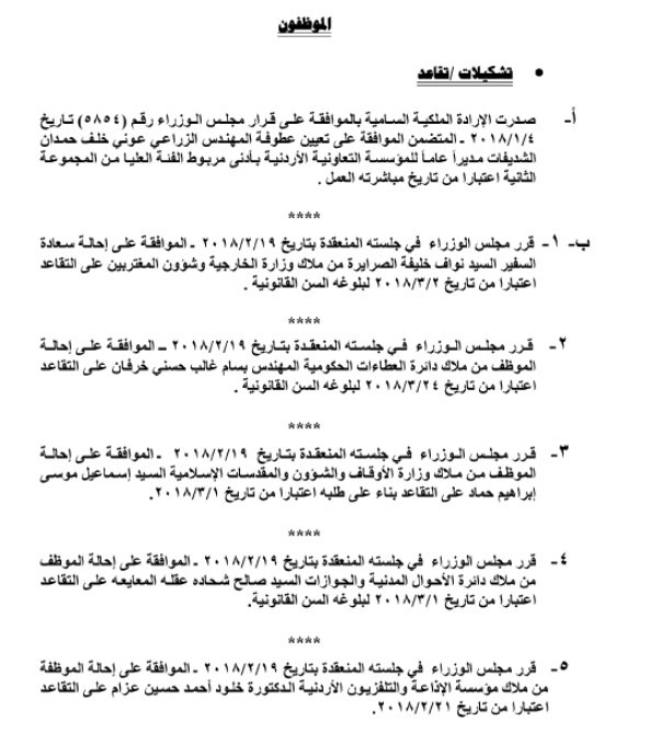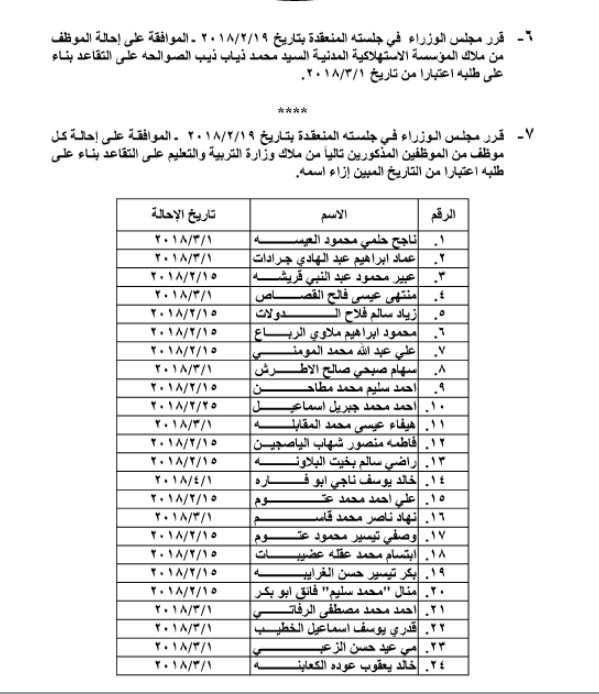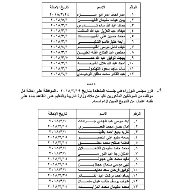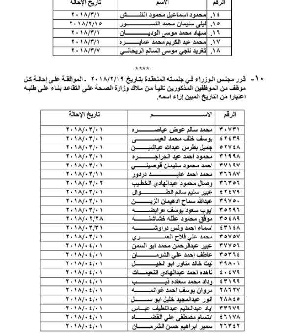قرر مجلس الوزراء إحالة عدد من الموظفين الى التقاعد من مختلف المؤسسات و الدوائر الحكومية :