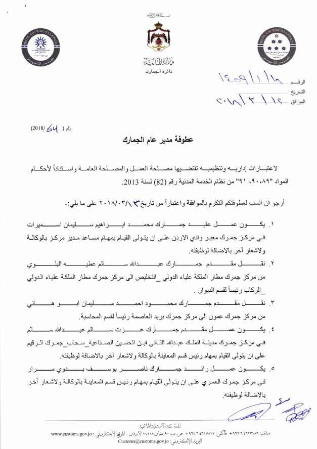 قرر مدير عام دائرة الجمارك اللواء وضاح الحمود، الاثنين، اجراء تنقلات في الدائرة شملت عددا من ضباط جمارك من مختلف الرتب.