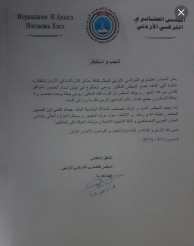 جاء ذلك في بيان اصدره المجلس العشائري الشركسي الأردني الممثل لكافة عشائر الشراكسة في الأردن؛ والذي تضمن ادانة كاملة واستنكار كبير للتصريحات الني اطلفها عضو المجلس الدكتور روحي شحالتوغ في كلمة له بمنطقة ذيبان في مادبا مؤخرا؛ والتي اعتبرها المجلس العشائري الشركسي عبر بيانه بأنها تصريحات تخصه وحده ولا علاقة للمجلس وجميع عشائر الشىراكسة بالاردن بكل ما ورد فيها .