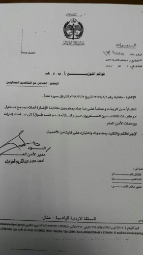 اصدر عطوفة مدير الامن العام اللواء فاضل الحمود تعميم موجه الى مديريات ووحدات الشرطه بمعاملة المتقاعدين من الامن العام والاجهزه الامنيه والعسكريه معاملة المعاملين واحترامهم عند مراجعتهم لتلك المؤسسات بالاظافه الى ايجاد طريقه للتواصل معهم وتلمس احتياجتهم وتلبيتها انطلاقا من حرص الامن العام على ايلاء كافة متقاعدي الاجهزه العسكريه والاهليه من ابناء الوطن الاعز الاهتمام الكافي وخلق الشعور لديهم بأنهم ما زالوا على رأس عملهم وعلو مكانتهم في عيون ابناء الجهاز كما وامر بالسماح لمركباتهم بالدخول لاي وحده تتبع لمديرية الامن لمن تقاعد برتبة مقدم