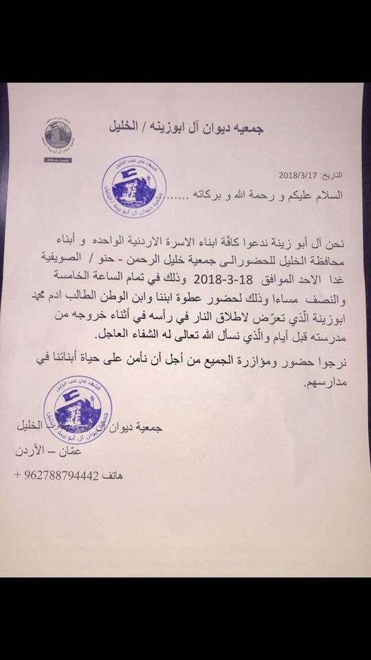 أخبار البلد - دعت عائلة أبو زينة العائلة الأردنية الواحدة لحضور عطوة الطالب "آدم محمد أبو زينة" في جمعية خليل الرحمن - حنو الكائنة بالصويفية في تمام الساعة الخامسة والنصف عصر اليوم الأحد.