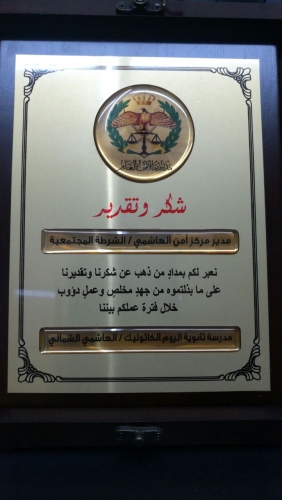 نشكر حضور رئيس مركز امن الهاشمي العقيد يحيى الطيب ونشكر الشرطه المجتمعية كل من الملازم عمر الخرابشه والوكيل احمد الحراحشه والمجلس المحلي في الهاشمي ونشكر قدس الاب جهاد عماري مدير عام مدارس مطرانية الروم الكاثوليك ونشكر قدس الاب عماد بواب الاب الروحي للمدرسة والهيئة الادارية والهيئة التدريسية وجميع الموظفين والطلاب والاهل الكرام والضيوف على تعاونهم في انجاح هذا اليوم حيث اشتمل الاحتفال على كلمات شكر وتقدير وثناء على الجهود المبذوله وتم عرض فقرات وقصائد وطنية وتوزيع الشهادات على الطلاب وتم تكريم المركز الأمني بدرع وشهادات شكر وتقدير .