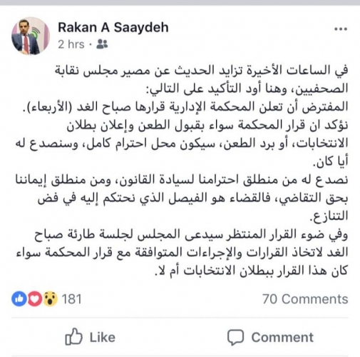 وأكد السعايدة في منشور على صفحته الشخصية في موقع التواصل الاجتماعي فيسبوك بأن مجلس النقابة المنتخب سيحترم وينفذ الحكم القضائي الذي من المفترض أن يصدر صباح الأربعاء، كان سلبا أو إيجابا.