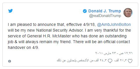 وكتب ترامب في تغريدة على "تويتر"، أن جون بولتون سوف يتولى مهامه في الـ 9 من نيسان/أبريل المقبل، وقدم الشكر لماكماستر على خدماته.