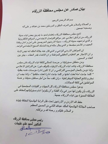 ناشد مجلس محافظة الزرقاء ابناء الزرقاء الاوفياء بالتوقف عن التراشق الاعلامي عبر مواقع التواصل الاجتماعي والمواقع الالكترونية بعد ما تابع باهتمام شديد ما يتم بين ابناء مدينة الزرقاء والذي لم تعهده هذه المدينه من قبل .