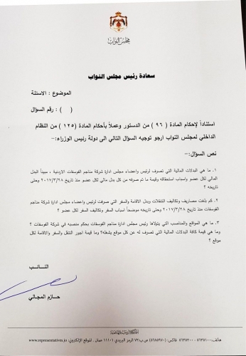 وبين المجالي لـ"أخبار البلد" أن السؤال يتعلق بالبدلات وتكاليف التنقلات وبدلات السفر التي تصرف لرئيس وأعضاء مجلس ادارة شركة مناجم الفوسفات.