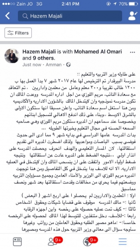 وأشار المجالي على أن بعض المعلمين والإداريين لم يحصلوا على رواتبهم، بالإضافة إلى القبض على صاحب المدرسة على خلفية قضايا وشيكات وحقوق اشخاص.