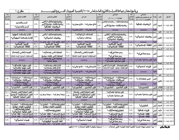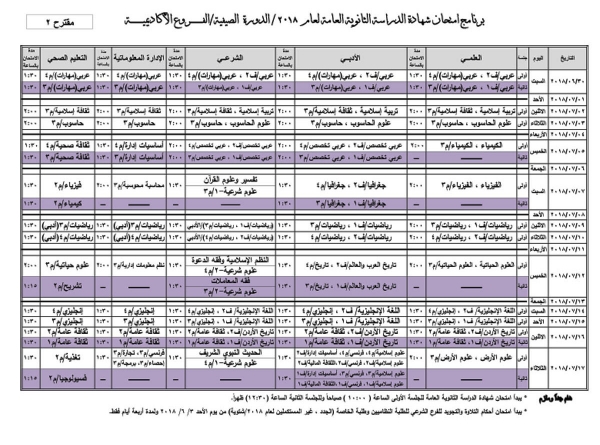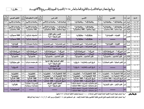 أعلنت وزارة التربية والتعليم، اليوم الأحد، مقترحين أوليين لبرنامج امتحان شهادة الدراسة الثانوية العامة للدورة الصيفية المقبلة للفروع الأكاديمية والمهنية.