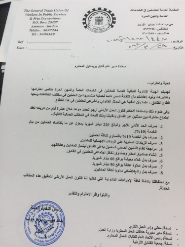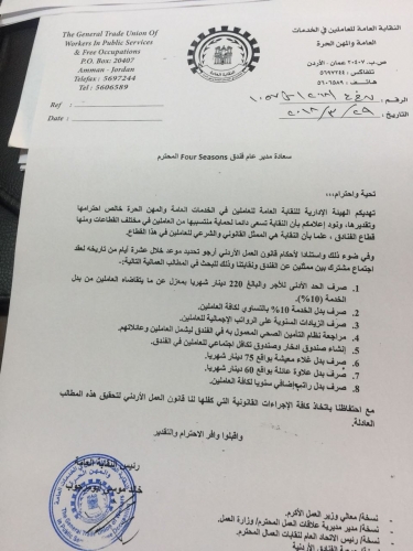 كما طالبت النقابة هذه الفنادق بمراجعة نظام التأمين الصحي وشمول العاملين وعائلاتهم به، وضرورة صرف بدل غلاء معيشة بقيمة 75 دينار للعاملين بهذه الفنادق، وصرف بدل علاوة عائلة.