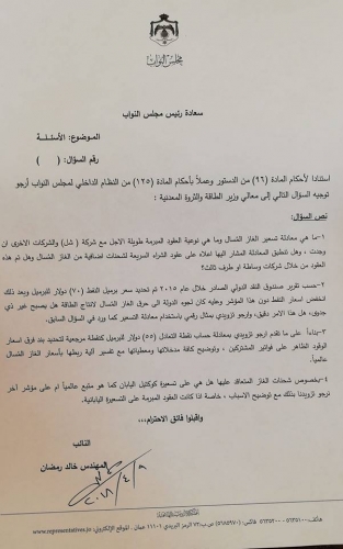 وجه النائب خالد رمضان سؤال نيابي إلى وزير الطاقة والثروة المعدنية عن معادلة تسعير الغاز المسال وما هي نوعية العقود المبرمة طويلة الأجل مع شركة (شل) والشركات الأخرىان وجدت،وهل تنطبق المعادلة المشار إليها على عقود الشراء السريعة لشحنات اضافية من الغاز المسال وهل تمت هذه العقود من خلال شركات وساطة أو طرف ثالث.