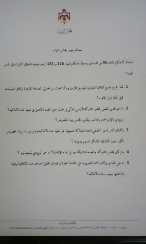 وجه النائب خليل عطية سؤالا نيابيا لرئيس الوزراء الملقي،عن سبب عدم تعديل اتفاقية التجارة الحرة بين الأردن وتركيا بحيث يتم تحقيق المصلحة الأردنية وتلافي السلبيات قبل اتخاذ قرار الإلغاء.