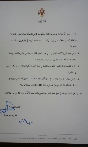 وطالب عطية بمعرفة الدور الفعلي لمجلس الشراكة الأردني التركي في بحث مدى التقدم الحاصل في تنفيذ هذه الاتفاقية، وما هو الدور الحقيقي للجنة المشتركة المسؤولة عن تنفيذ هذه الاتفاقية والعمل على تزويده بتقاريرها بخصوص تأكيد تنفيذ الاتفاقية بالشكل السليم،وما هي التدابير والاجراءات الضرورية التي اتخذها الطرفان لضمان تحقيق أهداف هذه الاتفاقية والوفاء بالتزاماتها بموجب هذه الاتفاقية.
