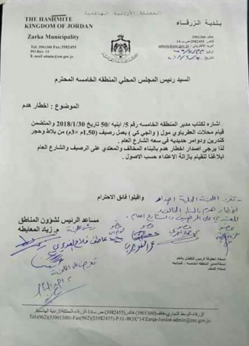 مؤخرا تم توجيه كتاب رسمي من شؤون المناطق في البلدية الى رئيس المجلس المحلي للمنطقة الخامسة، والمتضمن ازالة وهدم رصيف مخالف اقامته محلات العقرباوي مول والـ"جي كي" امام محالهم، وذلك بسبب الاعتداء الواضح على الشارع العام حيث تم بناء الرصيف من الحجر والبلاط بمساحة متر ونصف عرضا وبطول 3 امتار وذلك من سعة الشارع .
