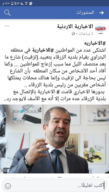 في تطور "دراماتيكي" لغياب الإدارة الفاعلة في بلدية الزرقاء، انتقلت موجة الاحتجاج على تدني الواقع الخدماتي المناط بأجهزة البلدية الى صفحات التواصل الاجتماعي، وقد صب أهالي المدينة جام غضبهم على مجلسهم البلدي الذي يقف مكتوف اليدين أمام سيل القضايا الخدمية التي يعانون منها ، وذلك في ظل غياب واضح لحضور او تواجد رئيس البلدية المهندس علي ابو السكر.
