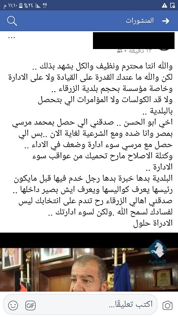الزرقاويون الذين ابدوا امتعاضهم على صفحات مواقع التواصل بسبب تردي أداء مجلس بلديتهم الذي وصفوه بالغائب الحاضر، اكدوا انهم كمواطنين خارج الصراعات والاتهامات التي تُكال لرئيس البلدية وجهوده كرجل حزبي لا رئيس بلدية افتقدوه بالميدان، مشيرين في منشوراتهم الى ان الميدان يحتاج مسؤولية