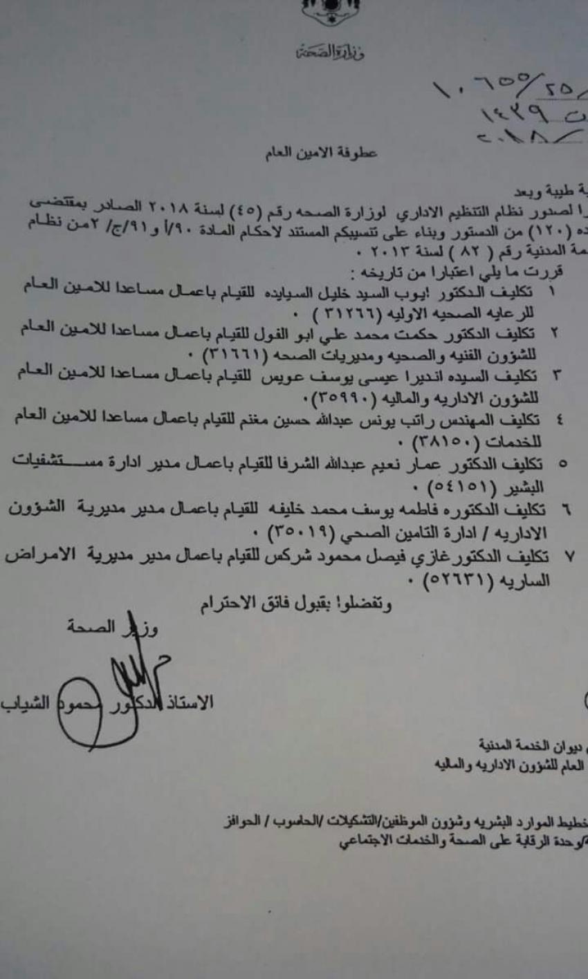 قرر وزير الصحة الدكتور محمود الشياب اجراء تشكيلات ادارية في الوزارة بناء على تنسيب الامين العام.