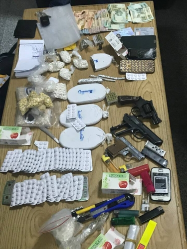 المخدر واربعة اسلحة نارية ( مسدسات ) وكمية من العتاد حيث بوشر بالتحقيق معهم