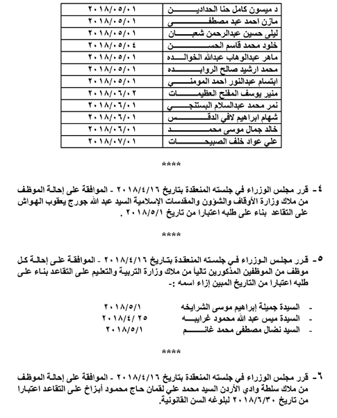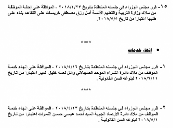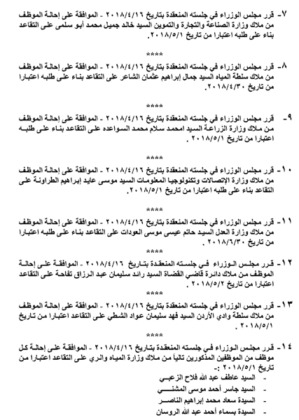 قرر مجلس الوزراء اليوم الاربعاء، الموافقة على احالة مجموعة من موظفي الدوائر الحكومية للتقاعد.