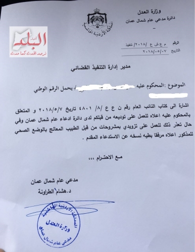 في تطورات جديدة بخصوص قضية تدخل وزير داخلية أسبق والتوسط لمطلوب بقضية مليونية، علمت "أخبار البلد" أن مدعي محكمة شمال عمان الدكتور هشام بيك الطراونة، قد وجه كتاب إلى مدير إدارة التنفيذ القضائي لمطالبتهم بتزويده في شروحات من قبل الطبيب المعالج بالوضع الصحي للمحكوم عليه.