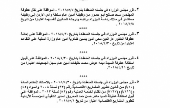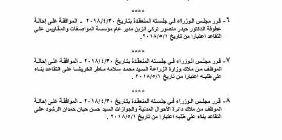 قرر مجلس الوزراء، اليوم الاربعاء، احالة مجموعة من الموظفين إلى التقاعد، وانهاء خدمات آخرين، وقبول استقالة عدد آخر.