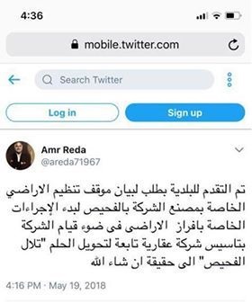 هذا ما كشفته تغريدة نشرت على صفحة تويتر الخاصة بالمدير التنفيذي لشركة لافارج في الاردن عمر رضا حيث اكد من خلالها تقديم شركة لافارج بطلب الى بلدية الفحيص لبيان موقف تنظيم الاراضي الخاصة بمصنع الشركة في الفحيص لبدأ الاجراءات الخاصة بفرز الاراضي وتحقيق حلم" تلال الفحيص "