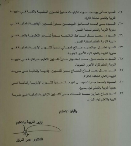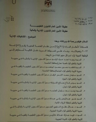 أخبار البلد - قرر وزير التربية والتعليم الدكتور عمر الرزاز اجراء تشكيلات ادارية شملت 31 موظفا على النحو التالي: